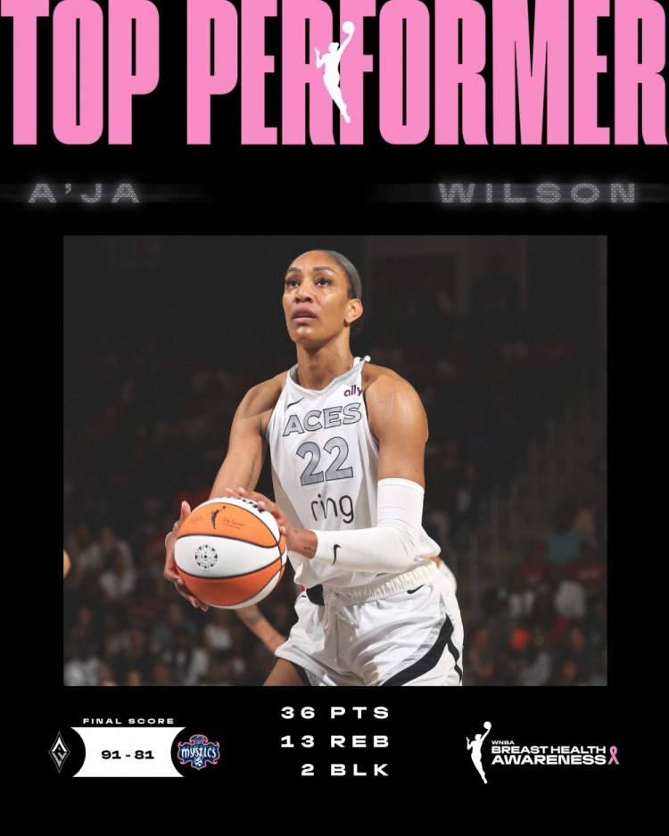 阿贾-威尔逊此役表现炸裂,出战33分钟,22投14中,三分2投1中,罚球8罚7中,爆砍36分13篮板2抢断2盖帽。